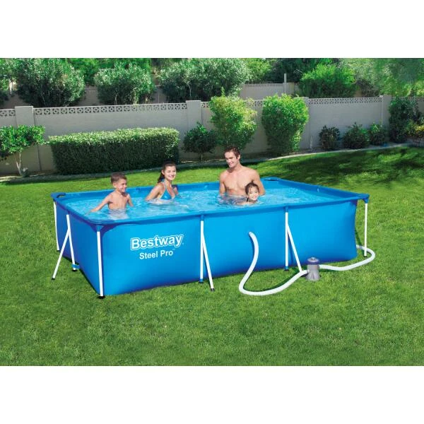 Het rechthoekig stalen frame zwembad is gemaakt van duurzaam Tritech materiaal bestand tegen UV stralen en chloor. Het frame is corrosiebestendig en getest op gewicht en druk van grotere hoeveelheden water. Bij het zwembad wordt een cartridgefilter van 1,2 m³/u geleverd waarmee je het water schoon kunt houden.