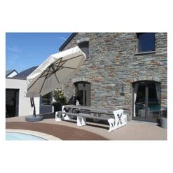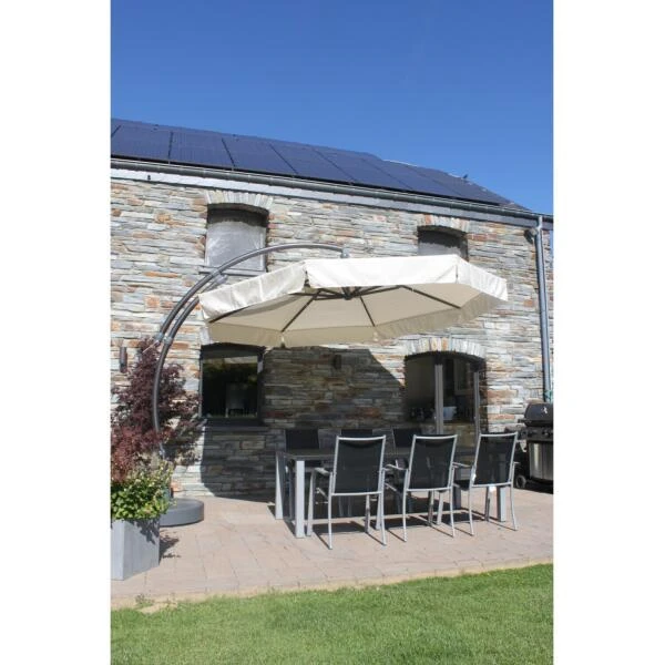Het taupe olefin doek heeft een ventilatieopening om windopvang te beperken. Een uniek remsysteem voorkomt schokken op het doek of de mast wanneer de parasol open staat. De zomen hebben dubbele naden en elke spaak heeft een veerbelaste zuiger om jouw parasol extra te beschermen. De antracietkleurige voet van hars kan gevuld worden met water, zand, grind of klinkers tot 150 kg.