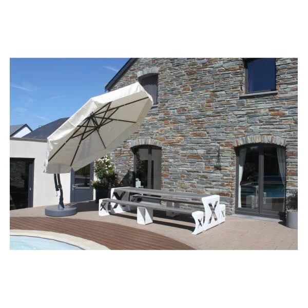 De grote Easy Sun 350 klassiek parasol kan tot 45° kantelen en biedt op elk moment van de dag bescherming tegen de zon. Twee wiggen bovenop zorgen voor een betere positionering van het doek tijdens het kantelen. De aluminium mast met epoxy coating (70 mm diameter) draait 360° op zijn centrale as, en dankzij een vergrendeling kan je de rotatie blokkeren. Het katrolsysteem maakt het openen en sluiten van de parasol eenvoudig en duurzaam.