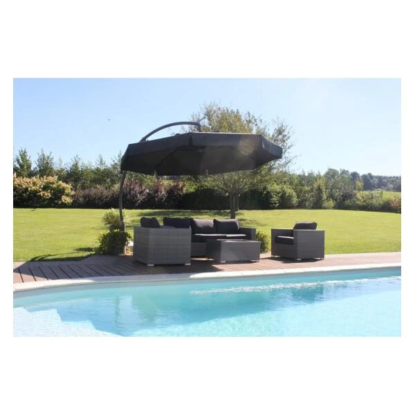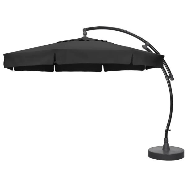 Het taupe olefin doek heeft een ventilatieopening om windopvang te beperken. Een uniek remsysteem voorkomt schokken op het doek of de mast wanneer de parasol open staat. De zomen hebben dubbele naden en elke spaak heeft een veerbelaste zuiger om jouw parasol extra te beschermen. De antracietkleurige voet van hars kan gevuld worden met water, zand, grind of klinkers tot 150 kg.