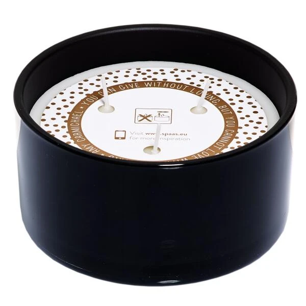De kaars heeft drie wieken en zit in een stevig zwart glas. De kaars komt in een wit met zwarte geschenkverpakking waardoor dit het ideale cadeau is.