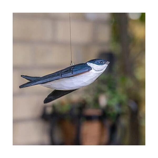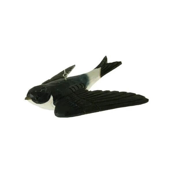 Ambachtelijk vormgegeven houten huiszwaluw. De zwaluw wordt op ware grootte weergegeven en is beschilderd met milieuvriendelijke verf.