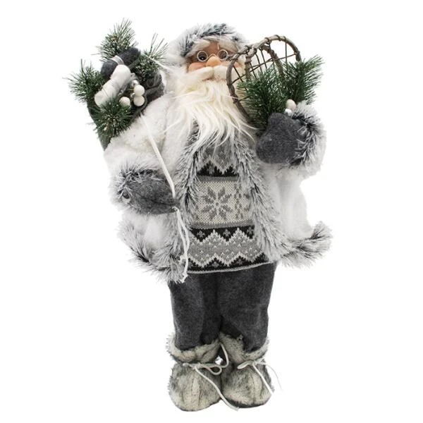 Een vrolijke kerstman met een lange witte baard, een handgebreide trui en een muts met een scandinavische print. Met zijn witte wollen jas, grijze broek en warme pantoffels in namaak bont is hij goed ingeduffeld om ’s nachts op stap te gaan.