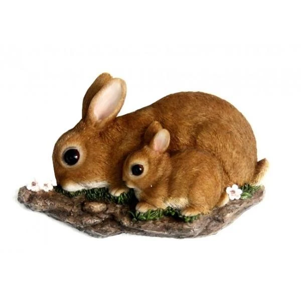 Een schattig konijnenduo met heldere donkere ogen en opstaande oortjes. Dit schattige muurbeeld is een verfijnde en natuurlijke weergave van een moeder met jong en is gemaakt in duurzaam geschilderd polyresin.