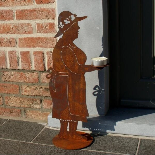 Het prachtige beeld van een marktvrouw met een draagplateau voor een bloemetje of een theelichtje, is gemaakt uit speciaal gevormd en behandeld metaal met een roestige look. Met de voorziene stevige basis kan je de marktvrouw zowel binnen als buiten een plekje geven.