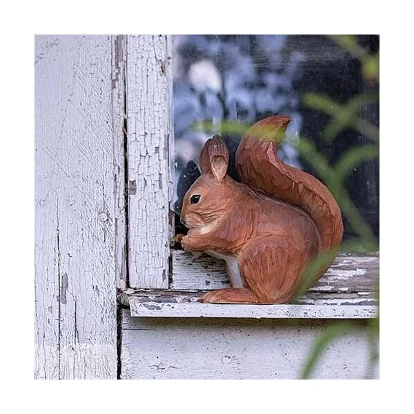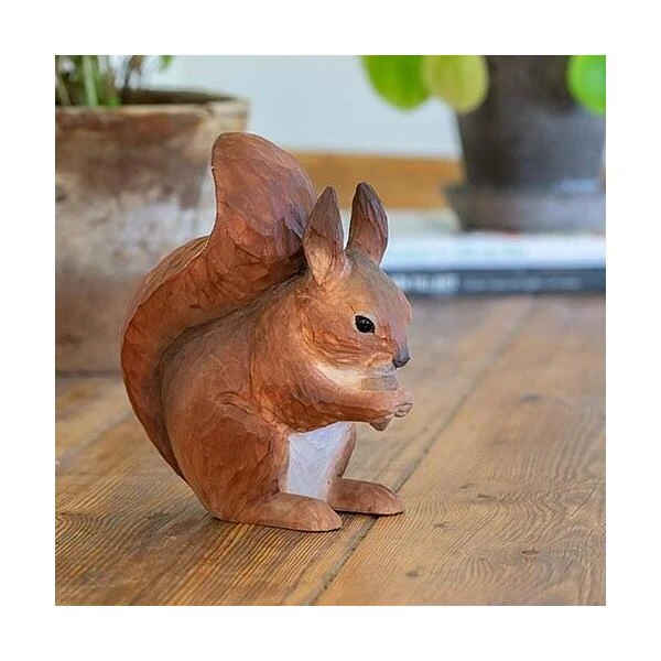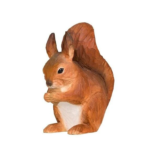 Ambachtelijk vormgegeven houten rode eekhoorn (Sciurus vulgaris). Dit beeld van een etende eekhoorn is beschilderd met milieuvriendelijke verf.