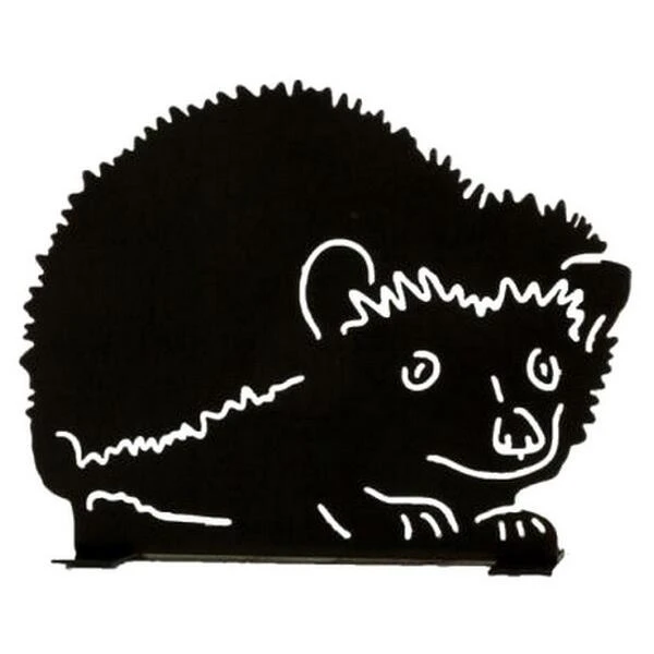 Ludiek en decoratief silhouet van een stekelige egel. Het silhouet is vervaardigd uit metaal bewerkt met een roestwerende, milieuvriendelijke zwarte verf.