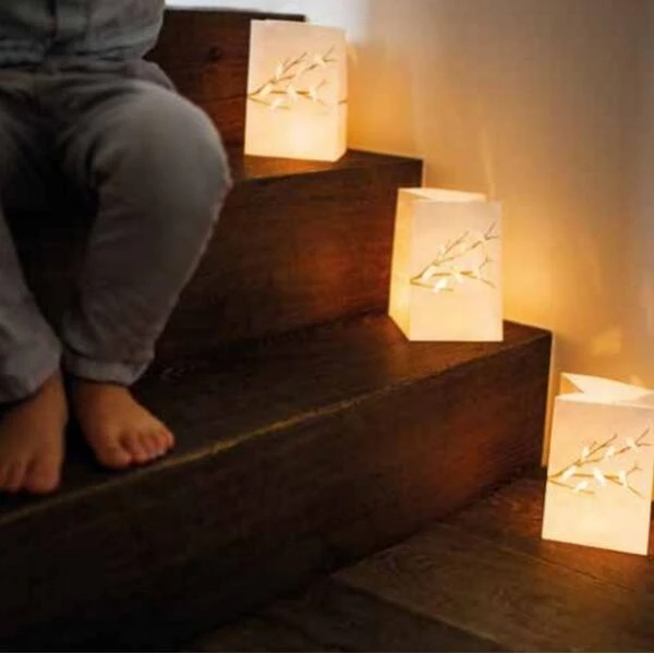 De zakjes zijn gemaakt van brandvertragend papier en dus veilig om er een theelichtje in te laten branden. De vlam straalt doorheen het papier waarop een decoratieve tak met vogels staat afgebeeld. Dit zorgt voor een heel mooi en decoratief effect!