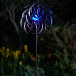 Deze dubbele windspinner met decoratieve ronde wieken heeft een gecrackeleerde lichtbol in het centrum. Deze glazen bol licht ’s avonds prachtig op in verschillende kleuren! De batterij van de mooie lichtbol laadt overdag op dankzij het aanwezige zonnepaneeltje.
